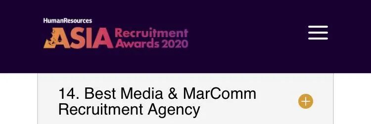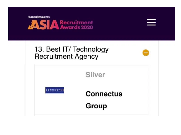 CONNECTUS以合作、诚信、积极、创新、恒学、坚持的全新价值观,不断攀升行业新高度,在亚太区优秀人力资源供应商评选Human Resources ASIA Recruitment Awards 2020中获得5项荣誉。